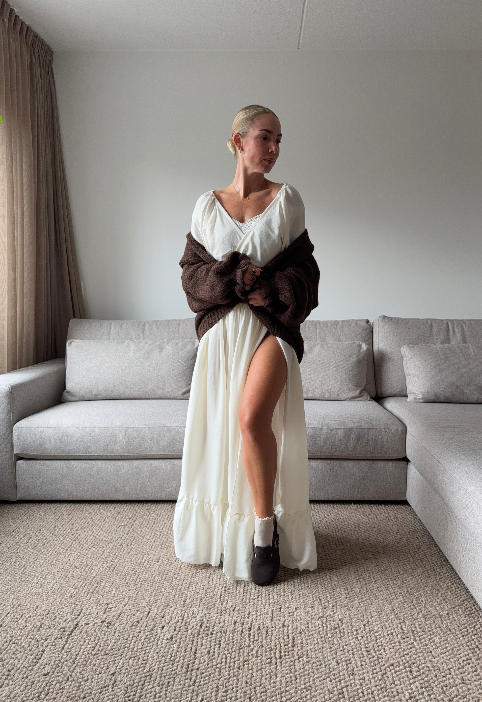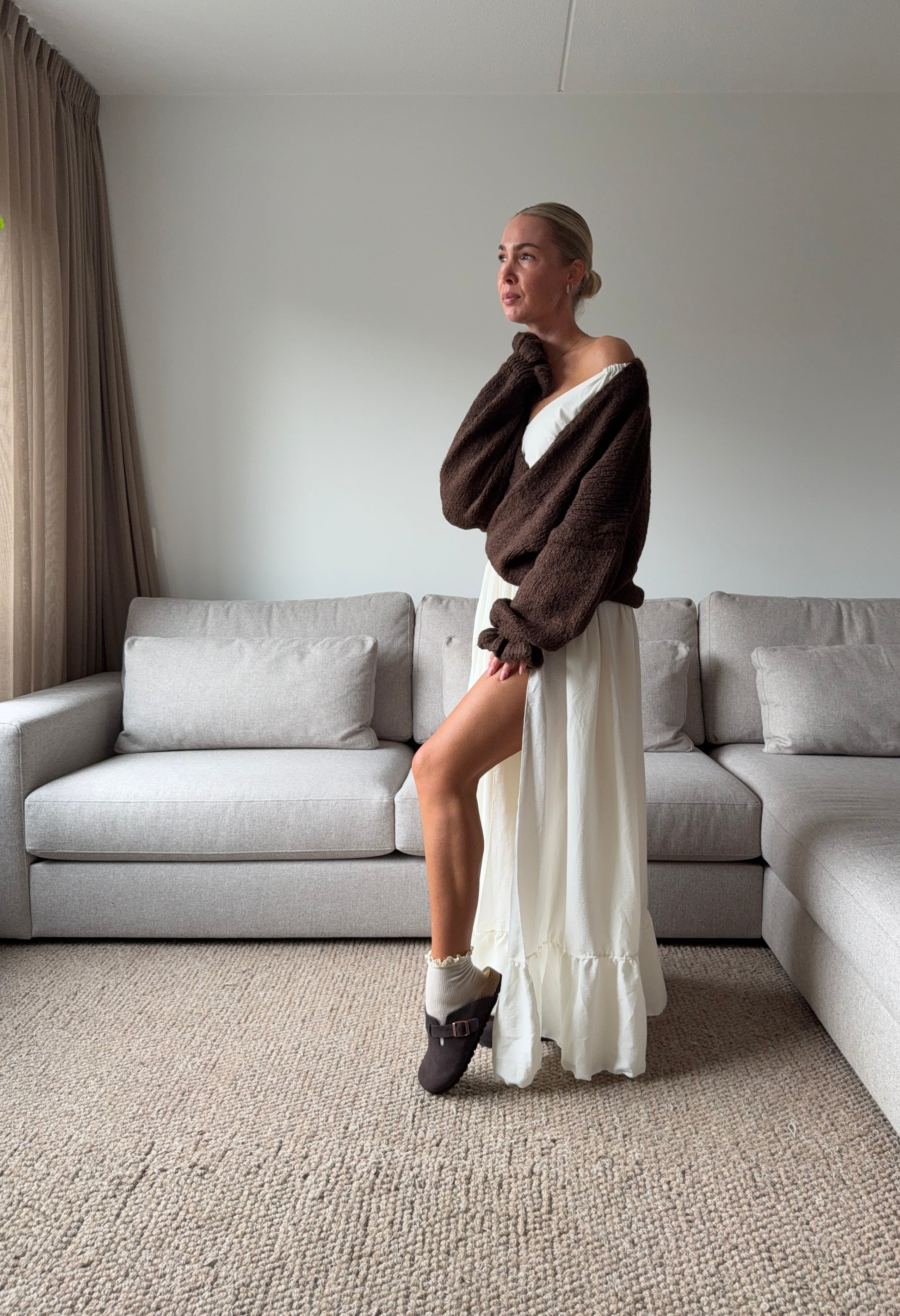 Beschrijving: Een heerlijk warm vest, met een prachtige ruffel mouw. Ideaal om over een jurk/boven een rok te dragen voor een styled shoot, of casual boven een broek. Het vest heeft geen knopen, valt open.